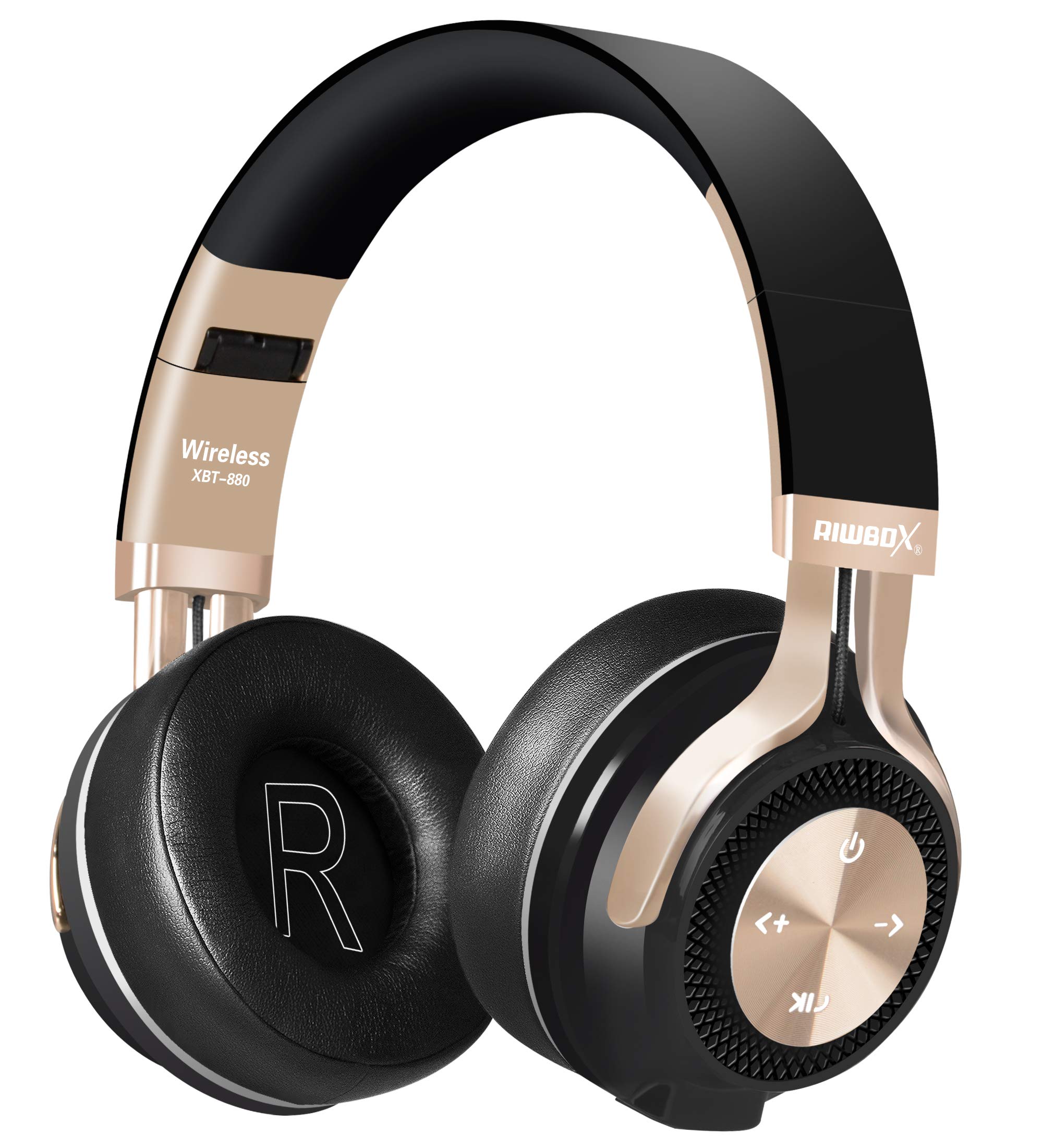 Riwbow - XBT-880 - Casque audio stéréo sans fil et filaire Bluetooth pliable à poser sur les oreilles avec micro et contrôle du volume pour PC/téléphone portable/télévision/iPad Noir et doré